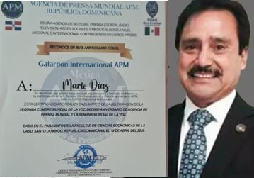 La Agencia de Prensa Mundial (APM) otorgó al periodista Maio Díaz, distinguido miembro del Club Primera Plana, el ’Galardón Internacional APM’, en reconocimiento a su amplia trayectoria en el periodismo y locución en México, y por su participación en la Cumbre Mundial de la Voz, celebrada en República Dominicana.